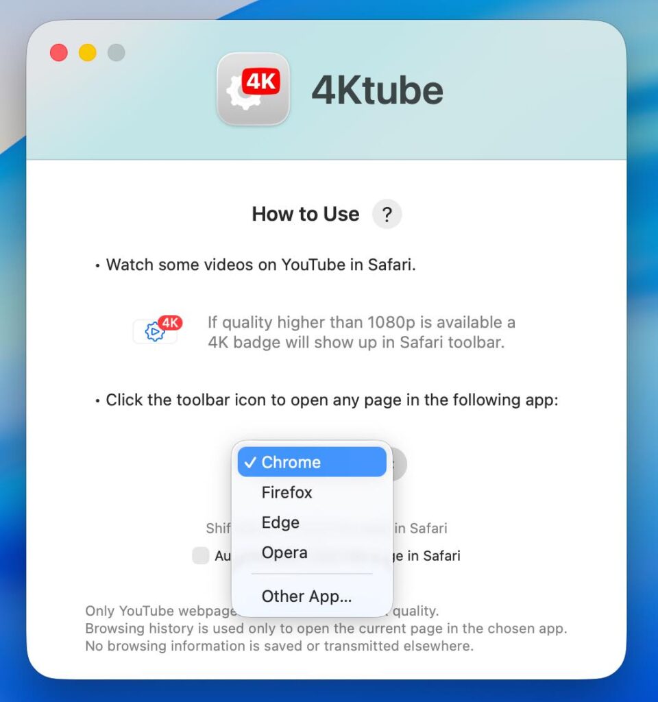Safariのツールバーから、開いているページをGoogle ChromeやFirefox、Microsoft Edge、Operaなど別のブラウザへすばやく渡せるSafari機能拡張。