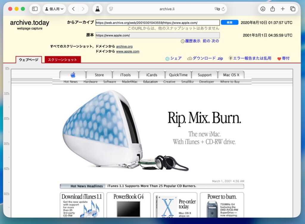 ツールバーのアイコンをクリックするだけで、いま開いているページの昔のスクリーンショットをアーカイブサイトの1つである「archive.today」で閲覧できるSafari機能拡張。