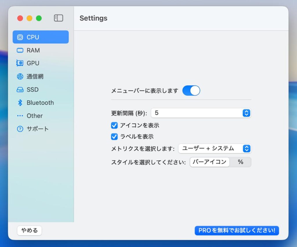 CPU、メモリ、ネットワーク、ストレージ、Bluetoothデバイスのバッテリー残量の情報をメニューバーに表示