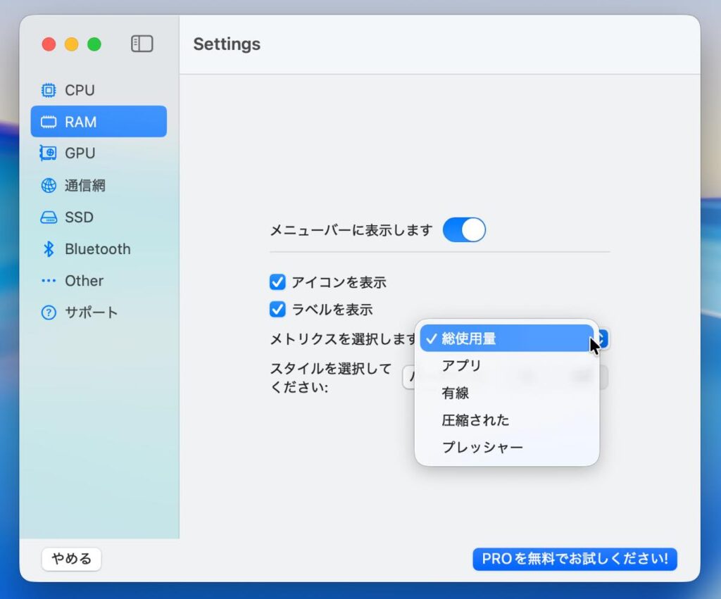 メモリは、合計、アプリ、有線、圧縮、または合計の使用量を監視。表示スタイルを棒グラフかパーセント表示かを選択可能。