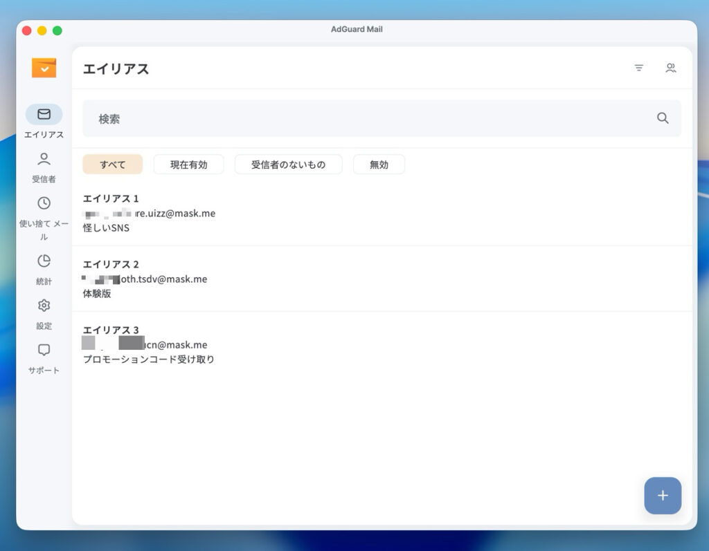 送信者に本来のメールアドレスを知らせずにメールを受信できるように、複数のエイリアスや使い捨てメールアドレスを作成できるサービス「AdGuard」 を手軽に利用できます。