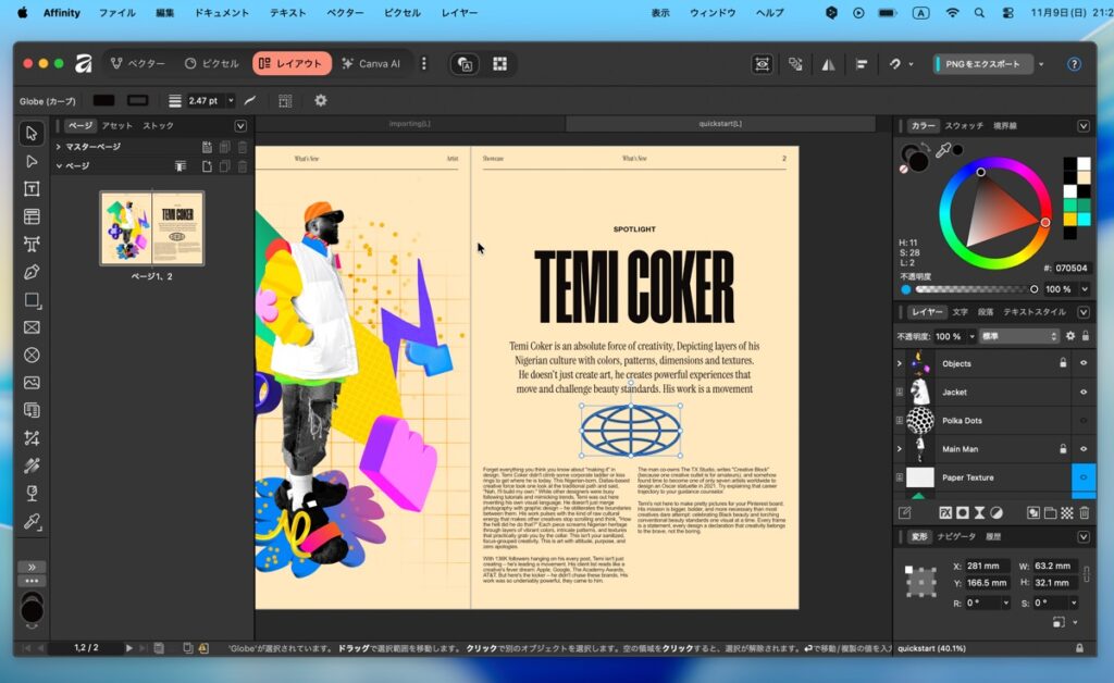 ベクター描画モード(旧Designer)、ピクセル編集モード(旧Photo)、レイアウトモード(旧Publisher)をひとつのアプリ内で切り替えて使用できます。作業フローを分断せず、例えばベクターで作った図をそのままレイアウトに組み込むといった連携がスムーズです。