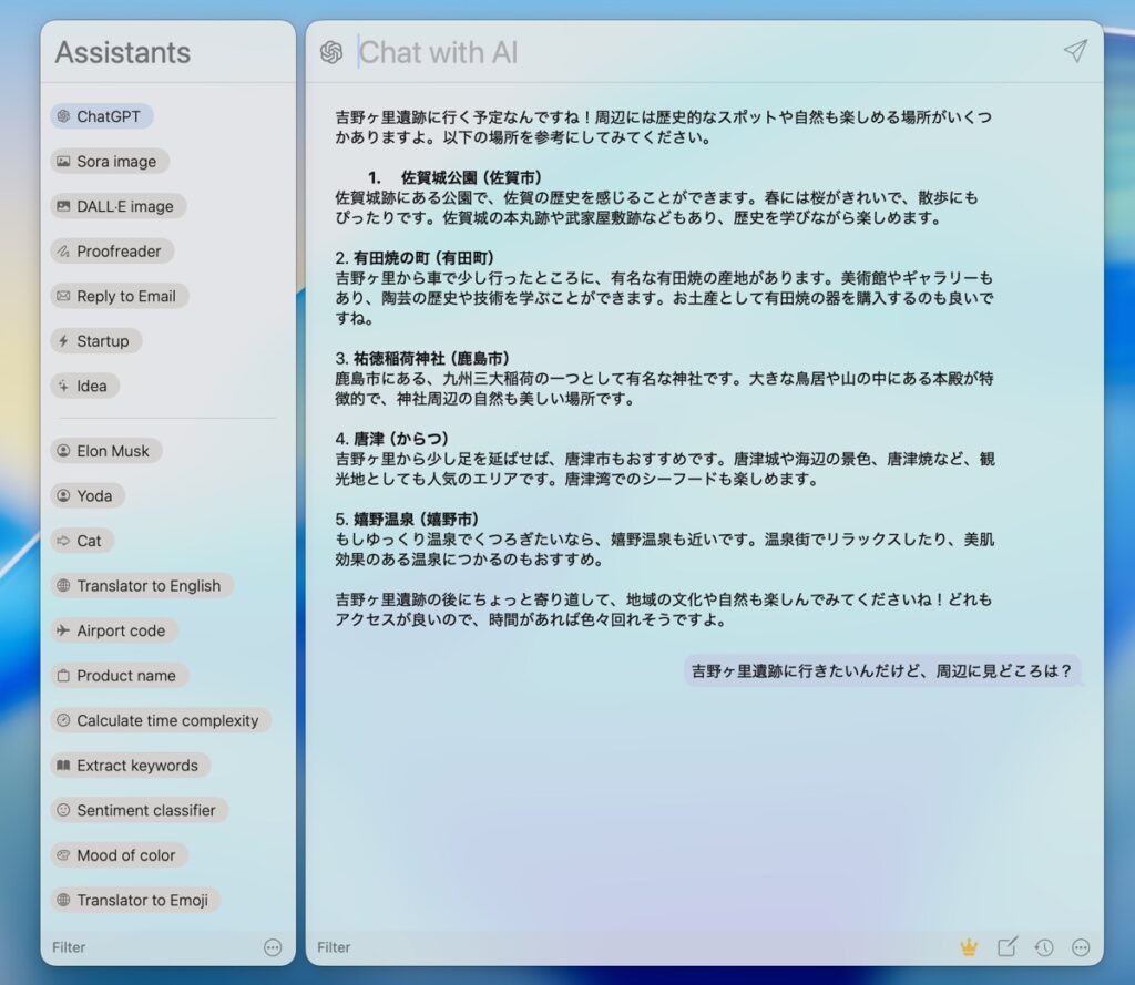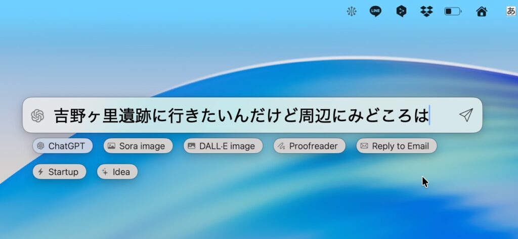 メニューバーのアイコンをクリックすると横長のウインドウが現れるので、そこに質問などをテキスト入力し、リターンキーを押すか右上にある紙飛行機のアイコンをクリックすると、それに対する回答やアドバイス、翻訳、要約などが返ってきます。