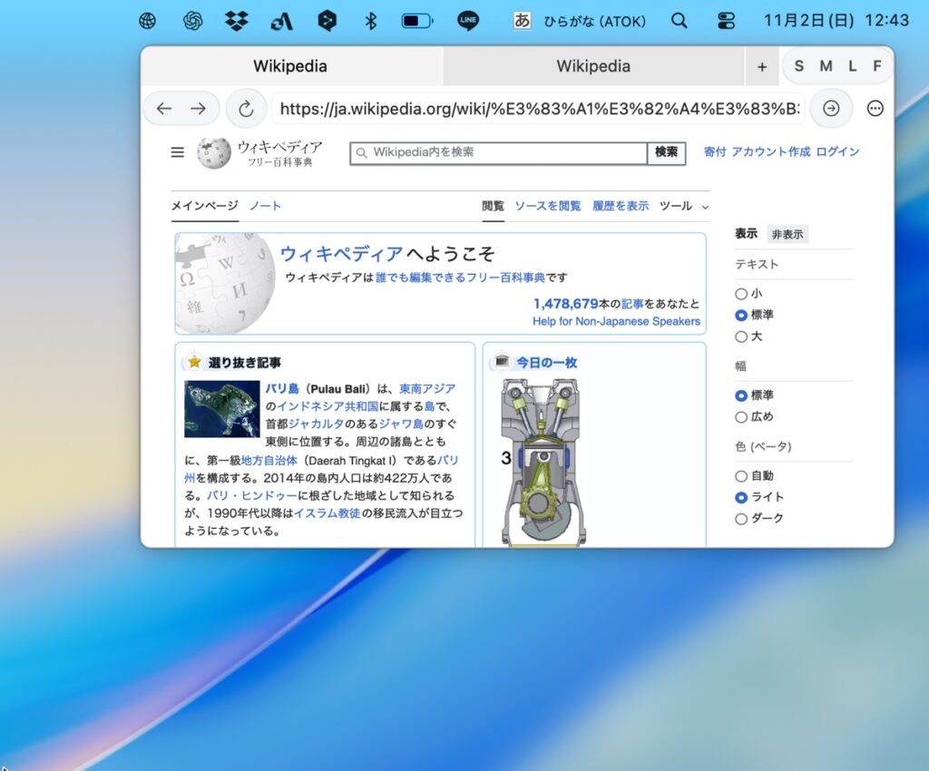 メニューバーのアイコンから素早く小さなWebブラウザを開けます。