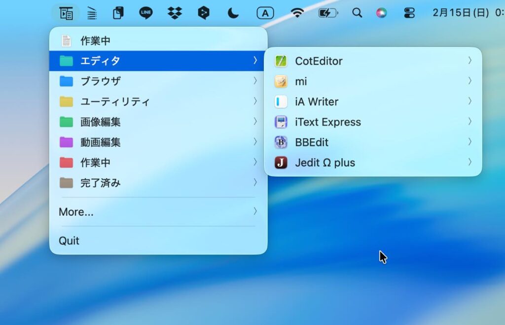 かつてのMacOS/漢字トーク(Classic)時代に人気を博した「AliasMenu」を思い起こさせるユーティリティです。