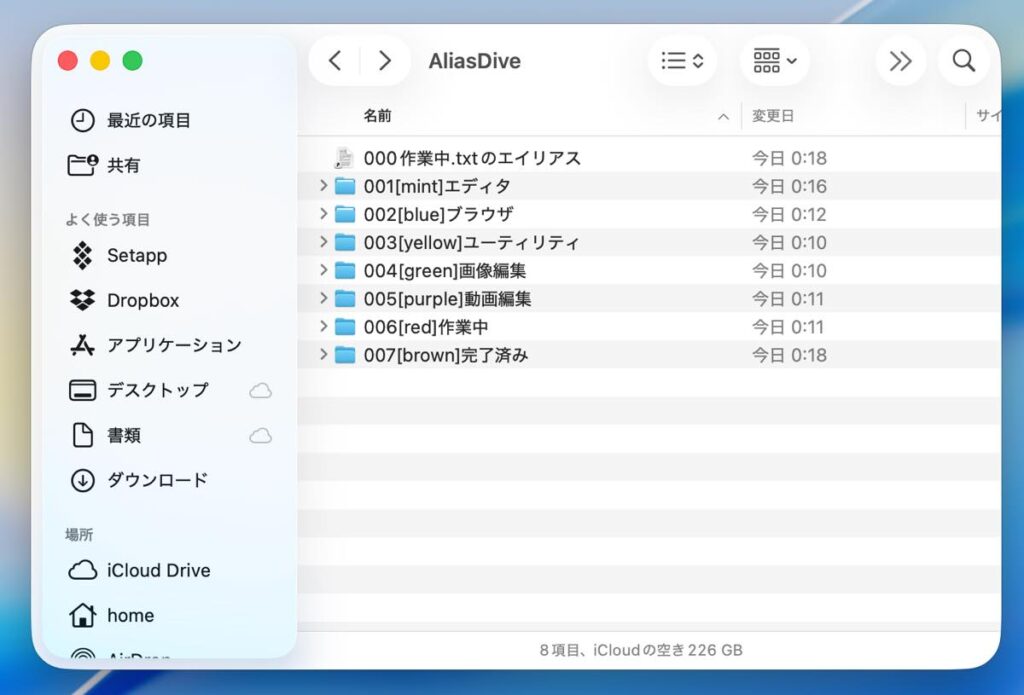 また、「AliasDive」フォルダにアンダーバーを3つ並べた項目を入れると、それが区切り線となってフォルダやファイルを視覚的に整理できます。