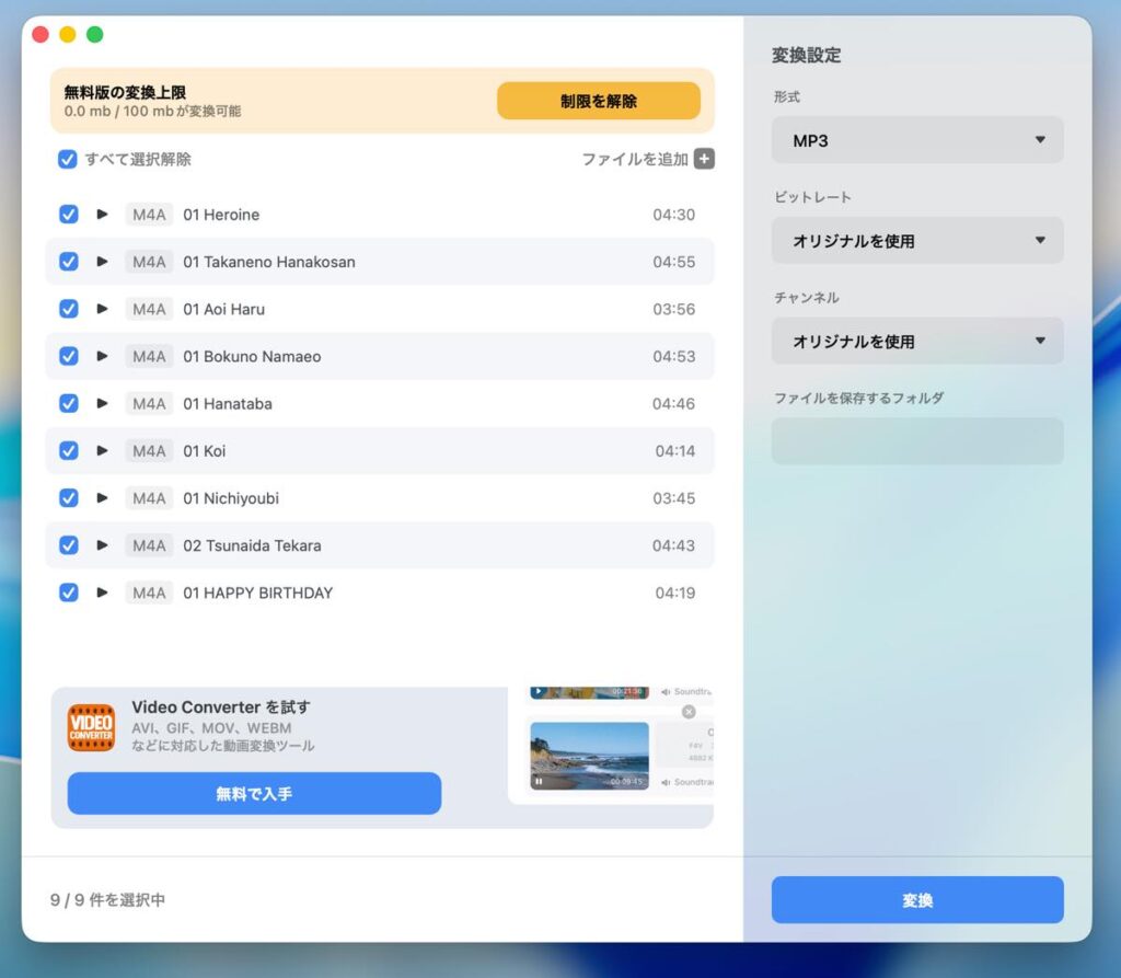 MP3、MP4、WAV、FLAC、AIFF、AAC、m4aなど9種類のフォーマットに変換できます。