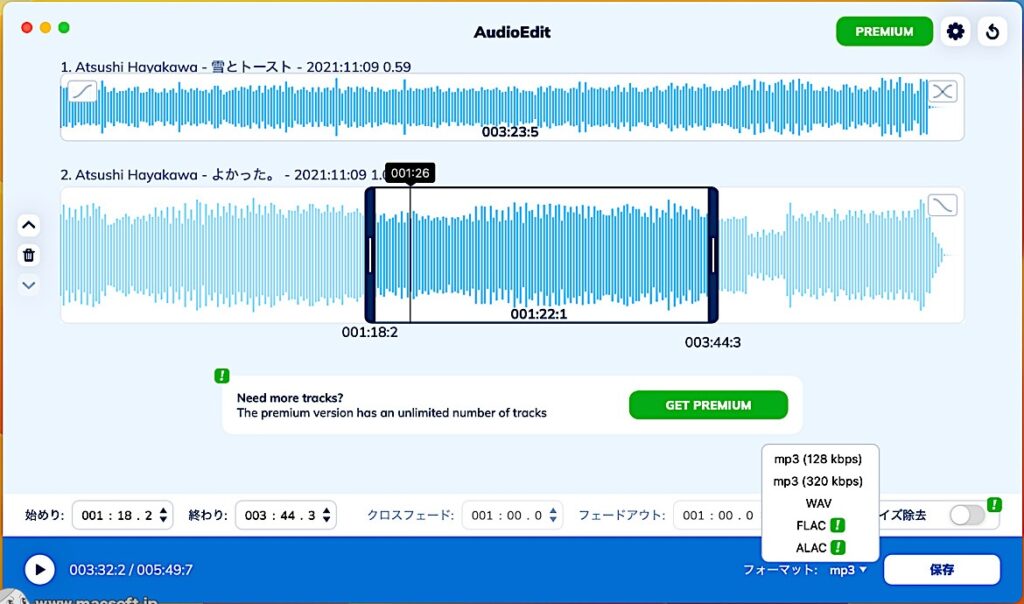 書き出し時はMP3(128kbs/320kbps)またはWAV形式から選べます。