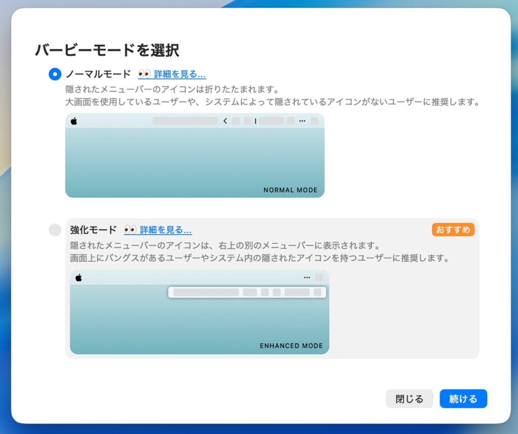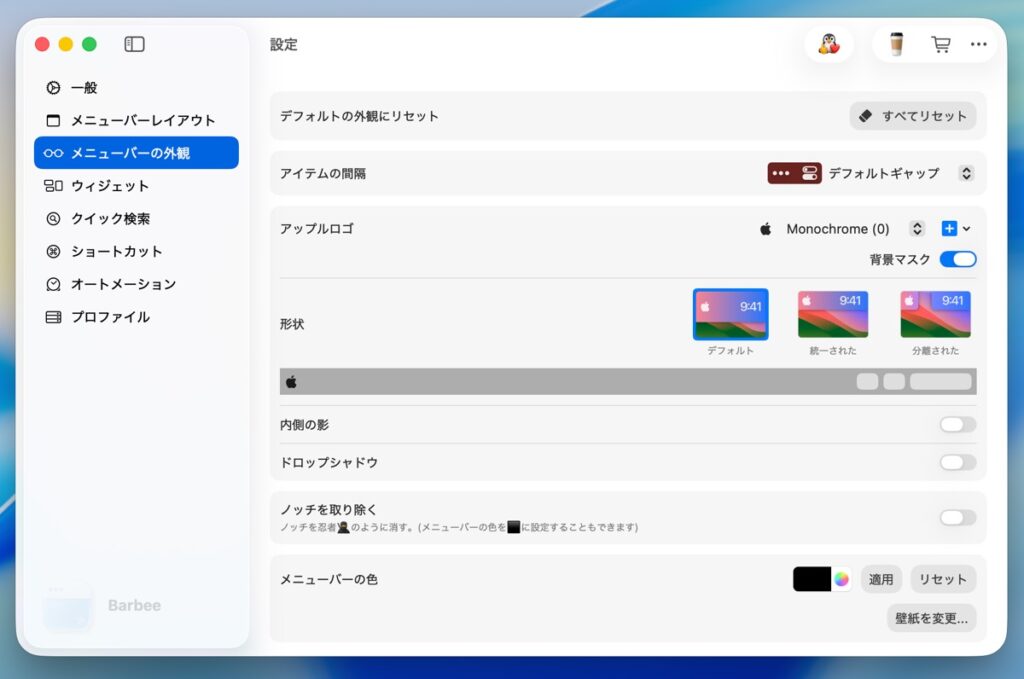メニューバーに並ぶアイコンの数が多すぎると、左のほうに並んでいるアイコンが画面中央のノッチ、あるいは「ヘルプ」メニューに隠れてしまうことがありますが、この「Barbee」を使えば、使用頻度の低いアイコンをメニューバーから隠しておき、必要な時だけ表示できます。