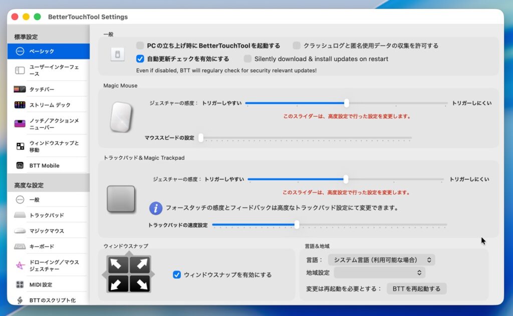 「Preferenses」ウインドウ上部にある「Basic Settings」をクリックすると、マジックマウスやトラックパッドにおけるジェスチャの感度や、マウスカーソルの移動速度をカスタマイズできます。