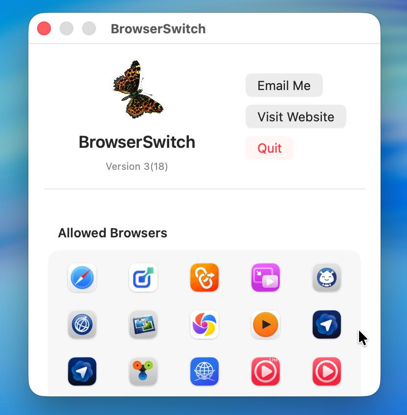 メニューバーのアイコンをクリックすると、Macにインストールされているブラウザがリストに並び、選択することで切り替えられます。