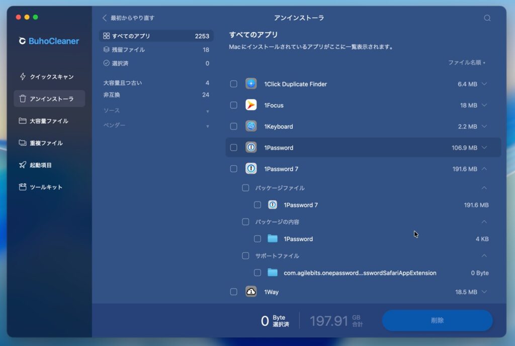 アプリ名をクリックすると、バイナリとパッケージの内容を選んで削除できます。「残留ファイル」では、削除済みアプリが残した関連ファイルがリストアップされ、チェックを入れた項目をまとめて削除できます。
