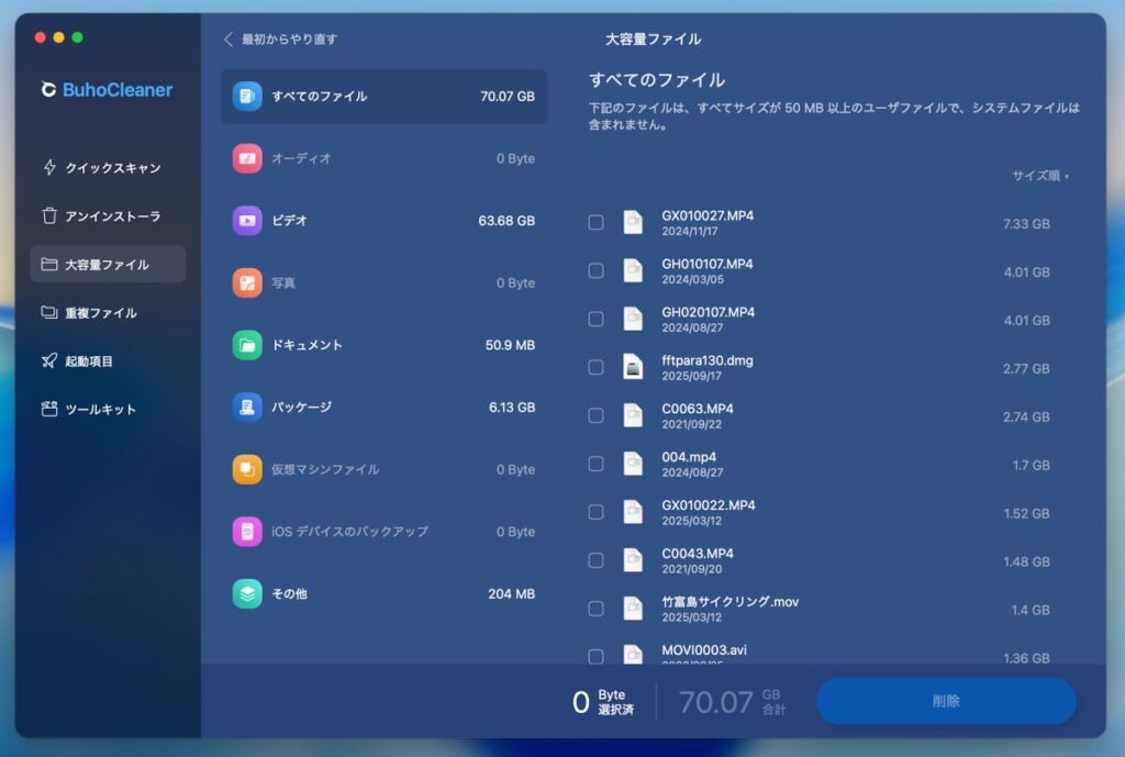 「スキャン」ボタンをクリックすると、右側に50MB以上(環境設定で変更可)のすべてのファイルがリストアップされます。左側の音声、ビデオ、画像、ドキュメント、パッケージ(アーカイブ)、その他というジャンルをクリックするとそのジャンルのみが表示されます。