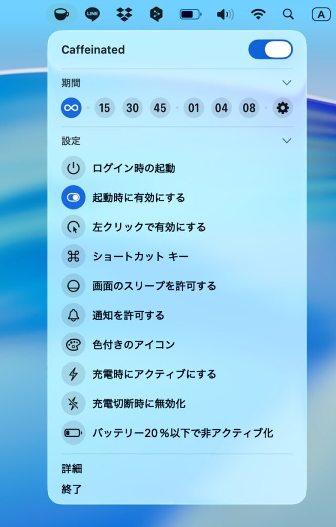 メニューバーのアイコンを1クリックするだけで有効にする、ショートカットキー(control+option+command+Cキー)で有効にする、画面スリープを許可する、通知を許可する、メニューバーのアイコンを色付きにする、充電器が接続されている場合に有効にする、バッテリー残量が20%以下になるとOFFにするといったオプション機能もあります。