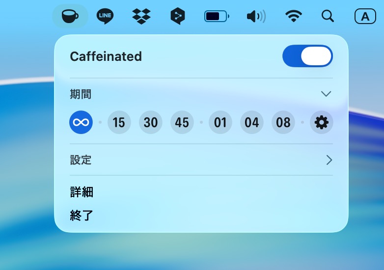 メニューバーのアイコンをクリックして「Caffeinate」のスイッチをオンにするだけで、画面がスリープ状態になるのを防いでくれます。