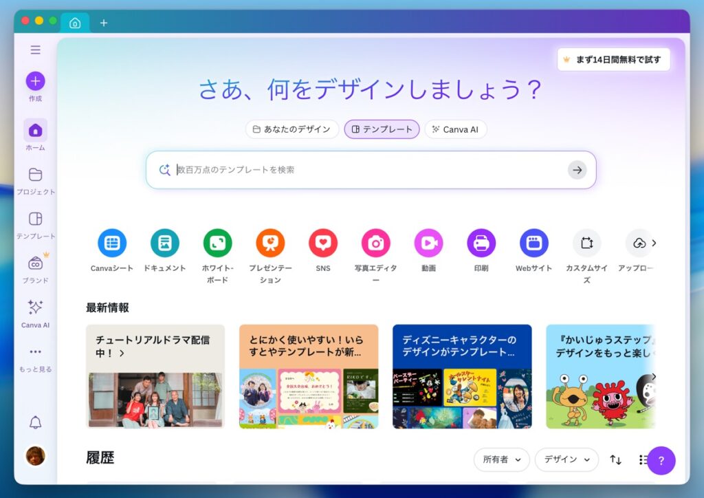 テンプレートを使って、チラシやフライヤー、ポスター、カード、名刺、メニュー表、プレゼン資料、SNS投稿用コンテンツ、写真コラージュ、スマホ動画などを作成できます。