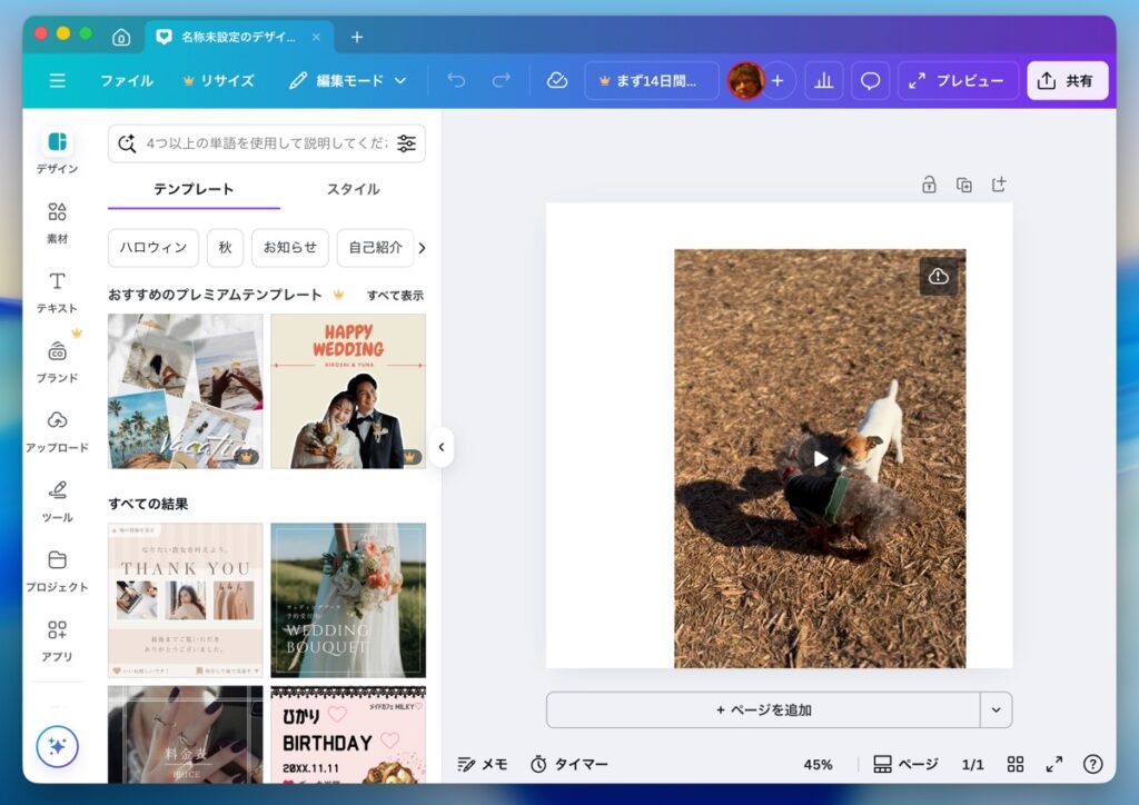 テンプレートは上部の検索ボックスから検索できるほか、カテゴリーからも探せます。画像編集と同じような操作で、動画も編集できます。