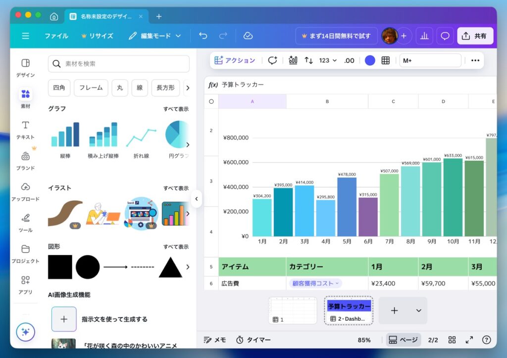 豊富に用意された無料テンプレートや素材を活用して簡単に見栄えのするデザインコンテンツを作成