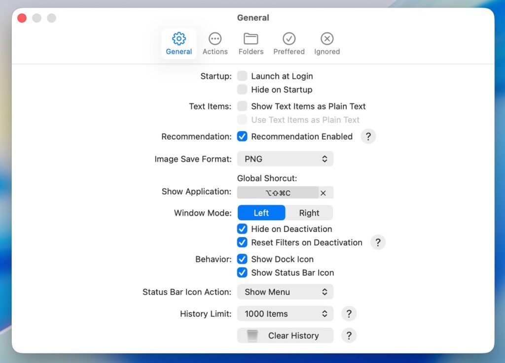 メニューバーのアイコンをクリックすると、画面左端(または右端)に縦長ウインドウが現れ、最近のコピー履歴が表示されます。