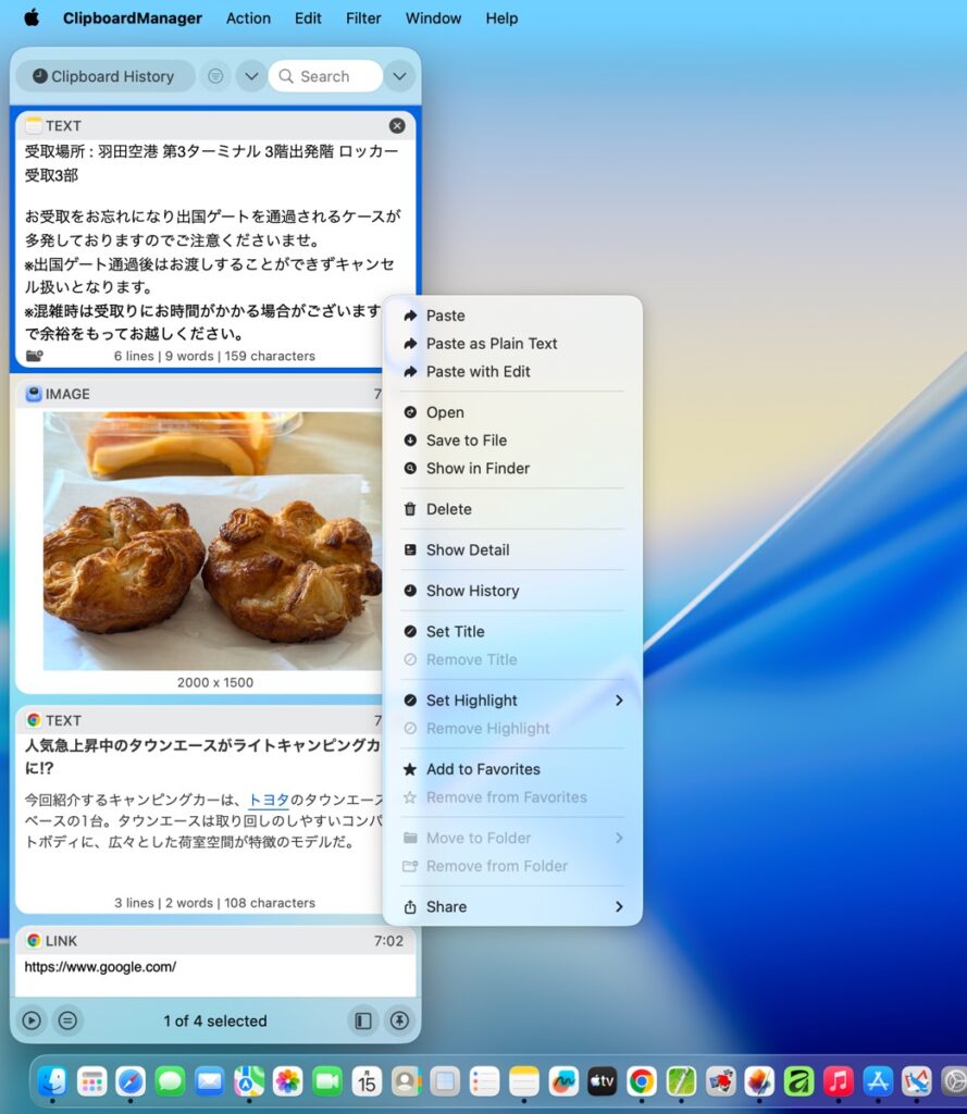 項目をダブルクリックすると、その内容がクリップボードに転送されます。