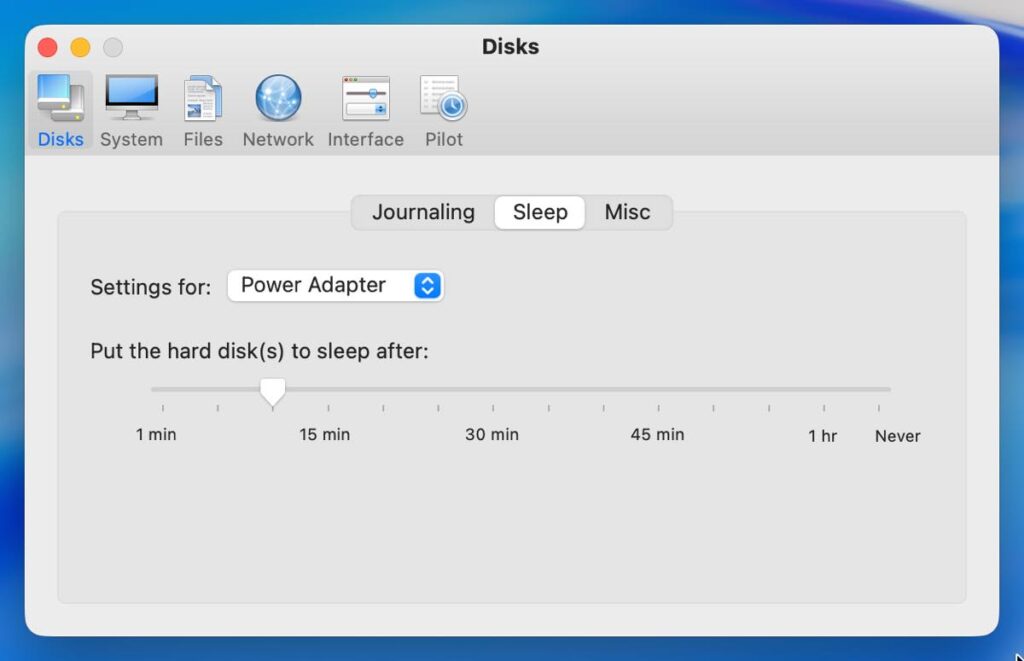 Disks:ディスクのアクセス権を修復したり、ジャーナリングの有効/無効を切替、ブートボリュームを確認、ディスクのSMARTステータスを確認、ユーザー権限を修復、、ディスクのスリープ(スピンダウン)時間を設定、スタンバイ遅延を変更、CD / DVDの強制取り出しなど。