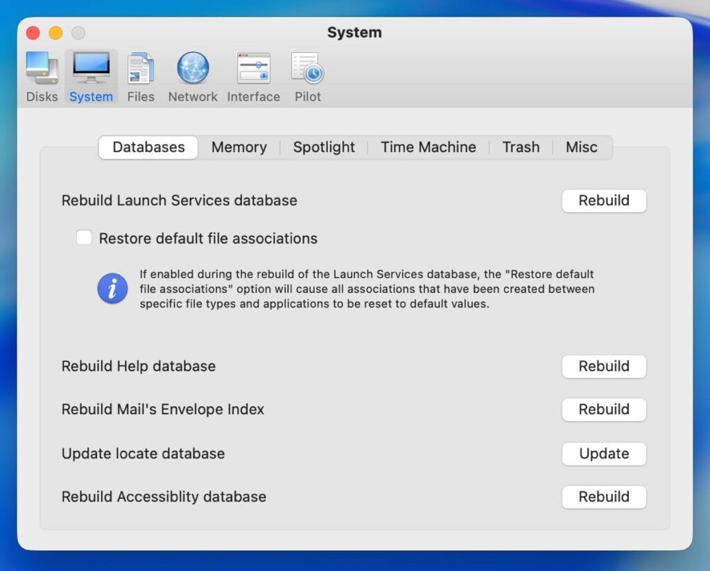 System:定期的なメンテナンススクリプトを実行、仮想メモリの使用を最適化、Spotlightのインデックス作成を管理、Spotlightインデックスを消去、Time Machine設定を変更、メールのインデックスを再構築、ゴミ箱を強制的に空にする、起動モードの変更または起動遅延の設定、起動音を無効にする、通知センターとアプリナップを無効にするなど。