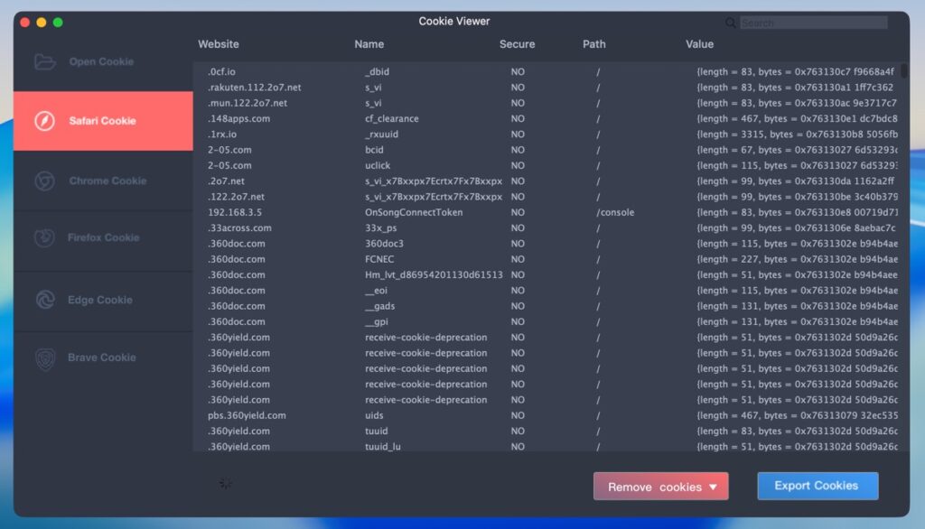「Cookie Viewer」を使えば、サファリやクロームなどのWebブラウザや、Macのソフト、iOSアプリのクッキーを一覧表示、削除、書き出しなどが可能です。
