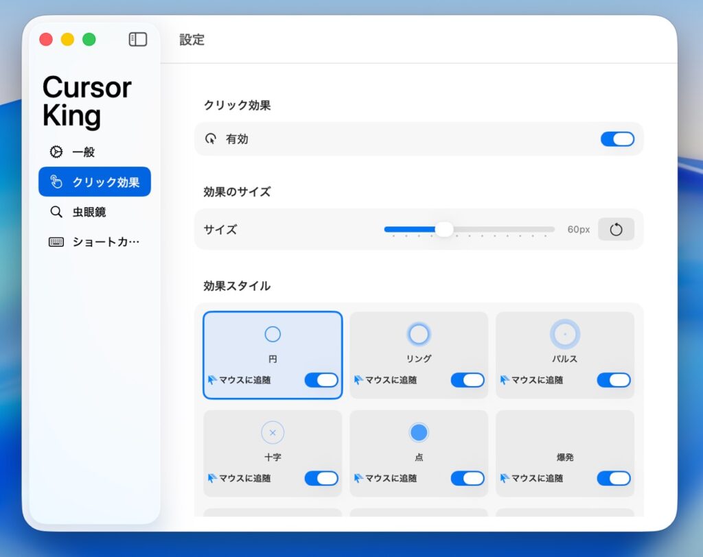 クリックした時にカーソルを丸く囲んで、Macの画面を見ている人にクリックしたことをわかりやすくするアプリです。