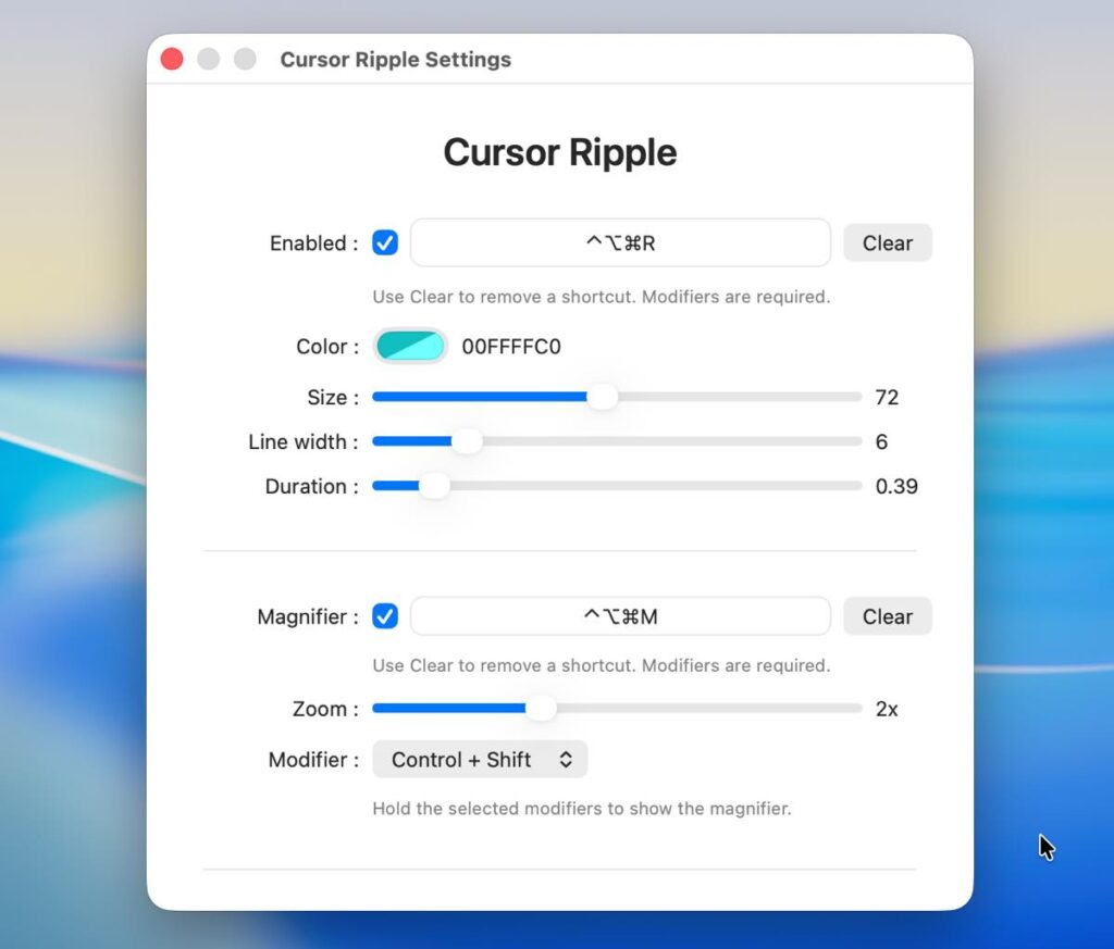 「Show Magnifier」をオンにしておくと、shift+controlキーを押すと虫眼鏡に変わり、カーソル周辺を拡大表示できます。