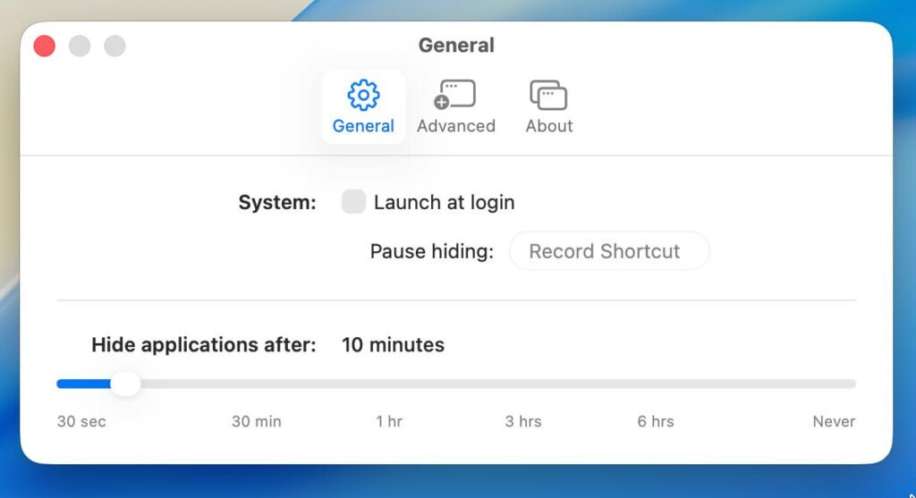 「General」タブでは、非アクティブになってから自動で隠れるまでの時間をスライダーで設定できます。30秒〜6時間の範囲で設定できるほか、一番右の「Never」にすると瞬時に隠れます。