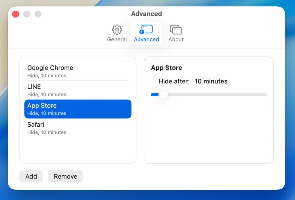 「Advanced」タブでは、隠れるまでの時間をアプリ毎に設定できます。「Action」で「Quit」を選択すると、指定時間が経過したときに自動でアプリを終了します。