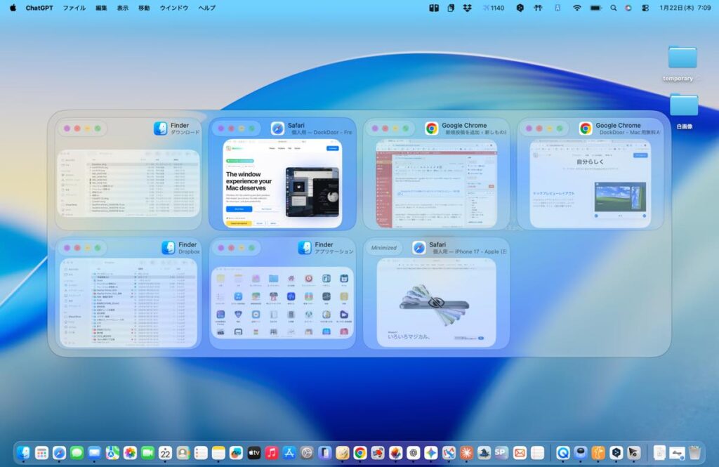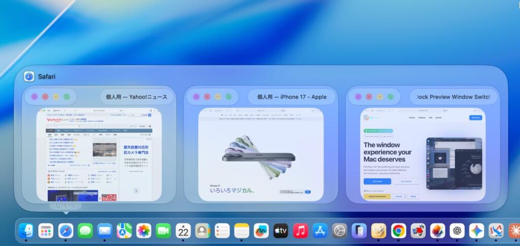 Dock上のアプリのアイコンにカーソルをあわせると、そのアプリが開いているウインドウのサムネイルを一覧表示して、切り替えることができます。
