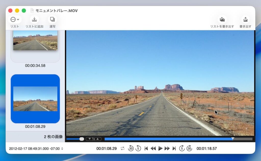 書き出しリストには、ビデオを再生しながら任意のタイミングで「リストに追加」ボタンを押して登録するか、コマ数と間隔(フレームまたは秒)を指定して、一定間隔で「連写」することが可能です。書き出し時は、ファイル名やナンバリング(時間/連番)の設定やサイズ指定なども可能です。