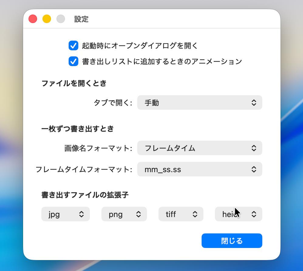 動画のフレームを画像(JPEG、PNG、TIFF)として書き出すツールです。