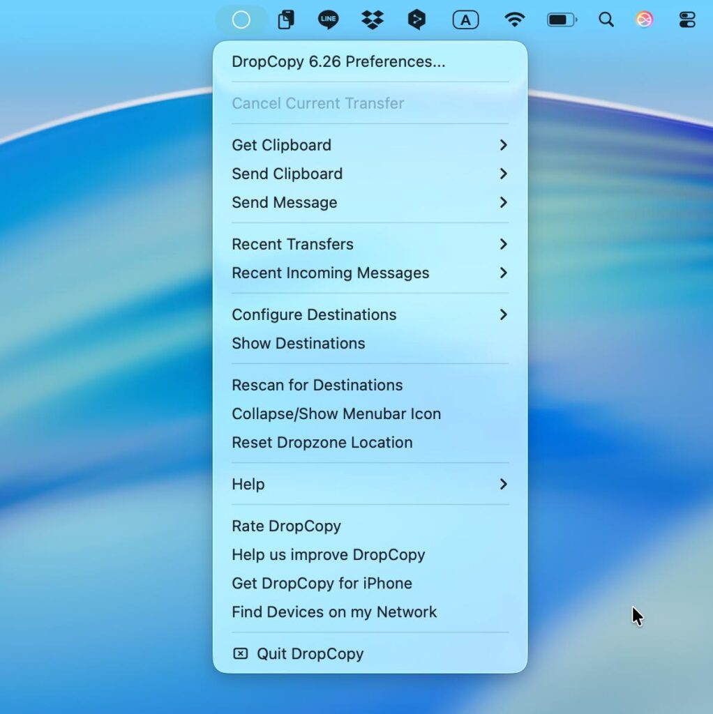 メニューバーの「○」アイコン、あるいはデスクトップ上に現れる丸いアイコン上に転送したいファイル/フォルダをドラッグし、相手の相手のマシン名がポップアップされたらその上にドロップすると、あらかじめ設定された転送先にコピーされます(デフォルトでは「ダウンロード」フォルダ内に入ります)