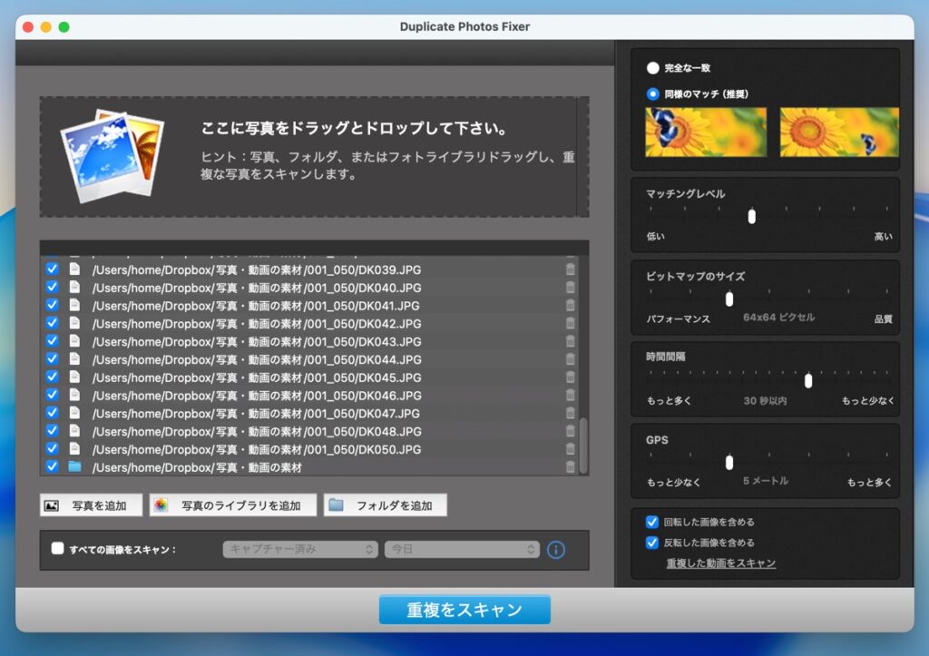ドラッグ&ドロップした写真、写真ライブラリ、画像の入ったフォルダをスキャンして、重複写真または似た写真を自動で抽出します。