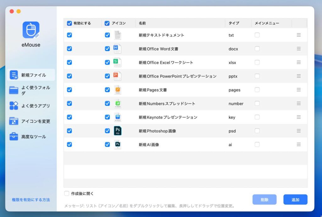 例えば「New File」は、テキスト、ワード、エクセル、ページズ、フォトショップ、イラストレーターなどがあらかじめ登録されていますが、別のファイル形式を追加できます