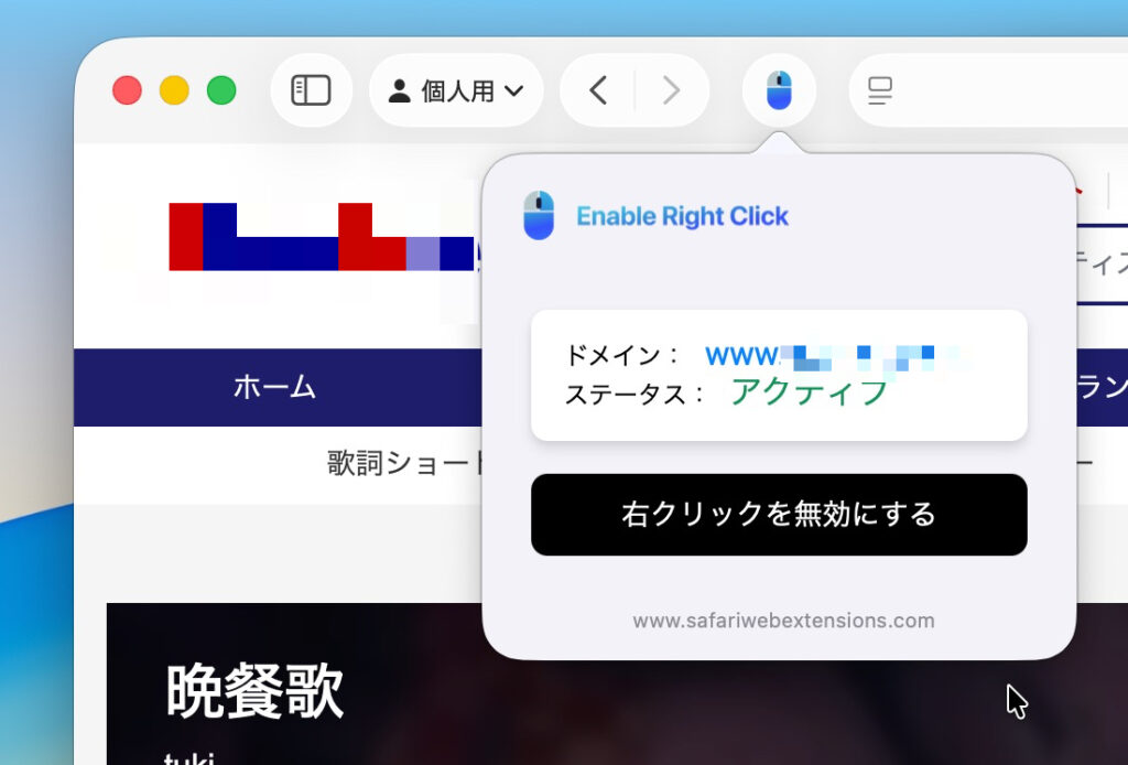 ページ内のテキストをコピーできないようにしていたり、右クリックを禁止しているWebサイトでも、テキストを選択したり右クリックができるようにするSafari機能拡。