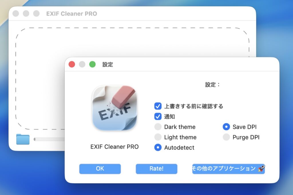 起動すると現れるウインドウに写真をドラッグ&ドロップすると確認メッセージが表示され、「Yes」をクリックするとEXIFが削除されます。