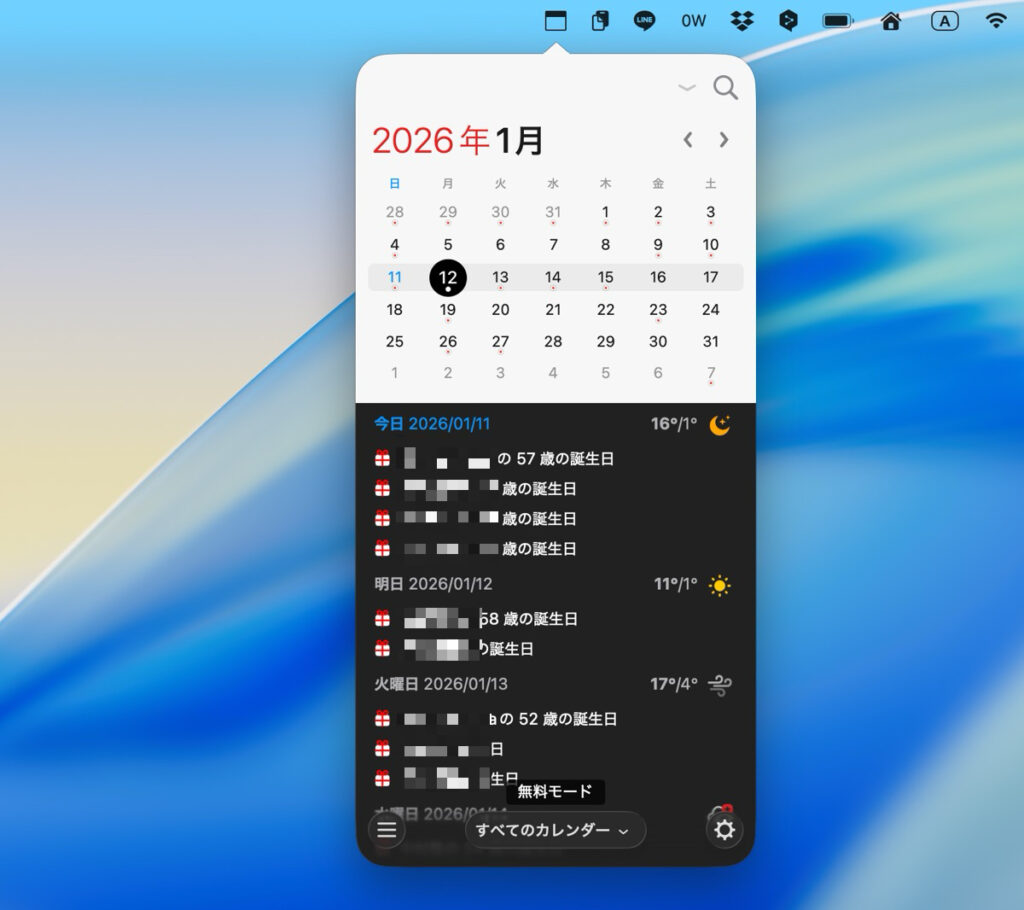 メニューバーのアイコンから、iCloud、Google、Exchangeカレンダーの予定(イベント)を素早く閲覧/編集できるほか、ファイルや画像を直接アップロードすることも可能。