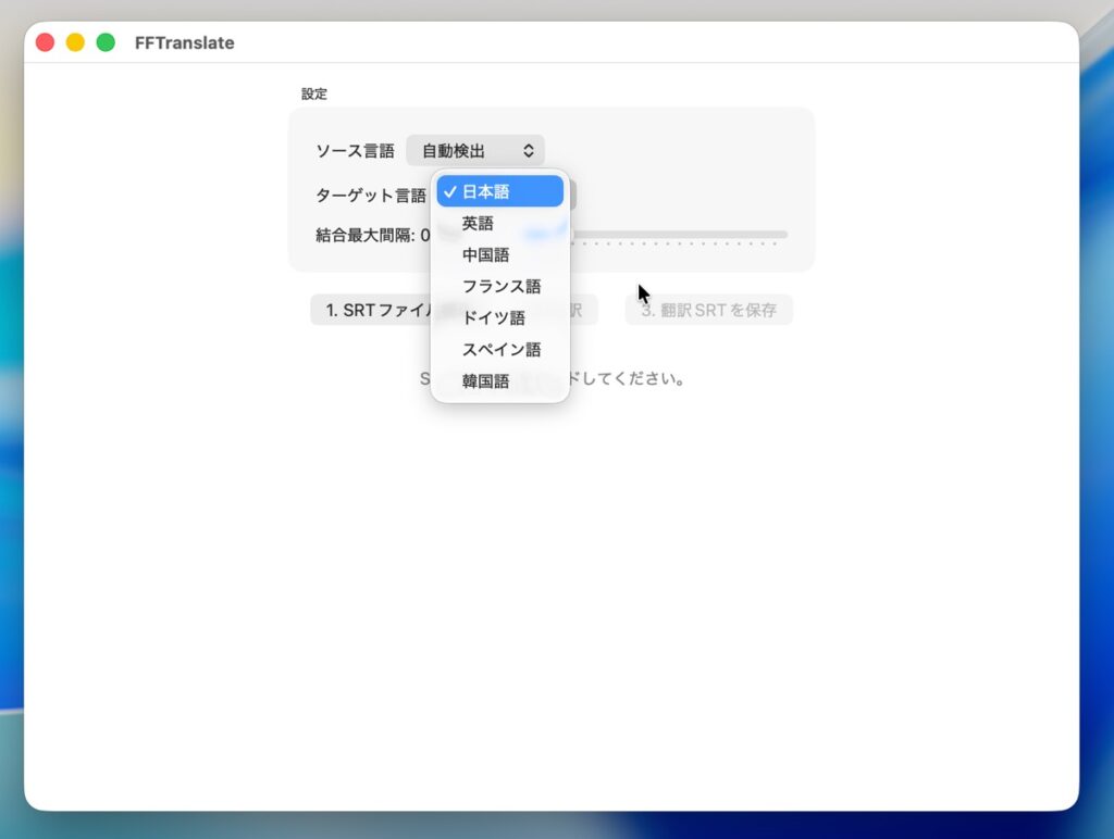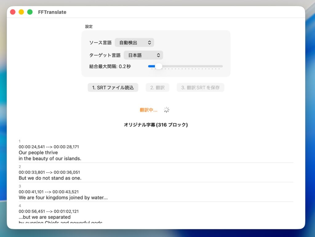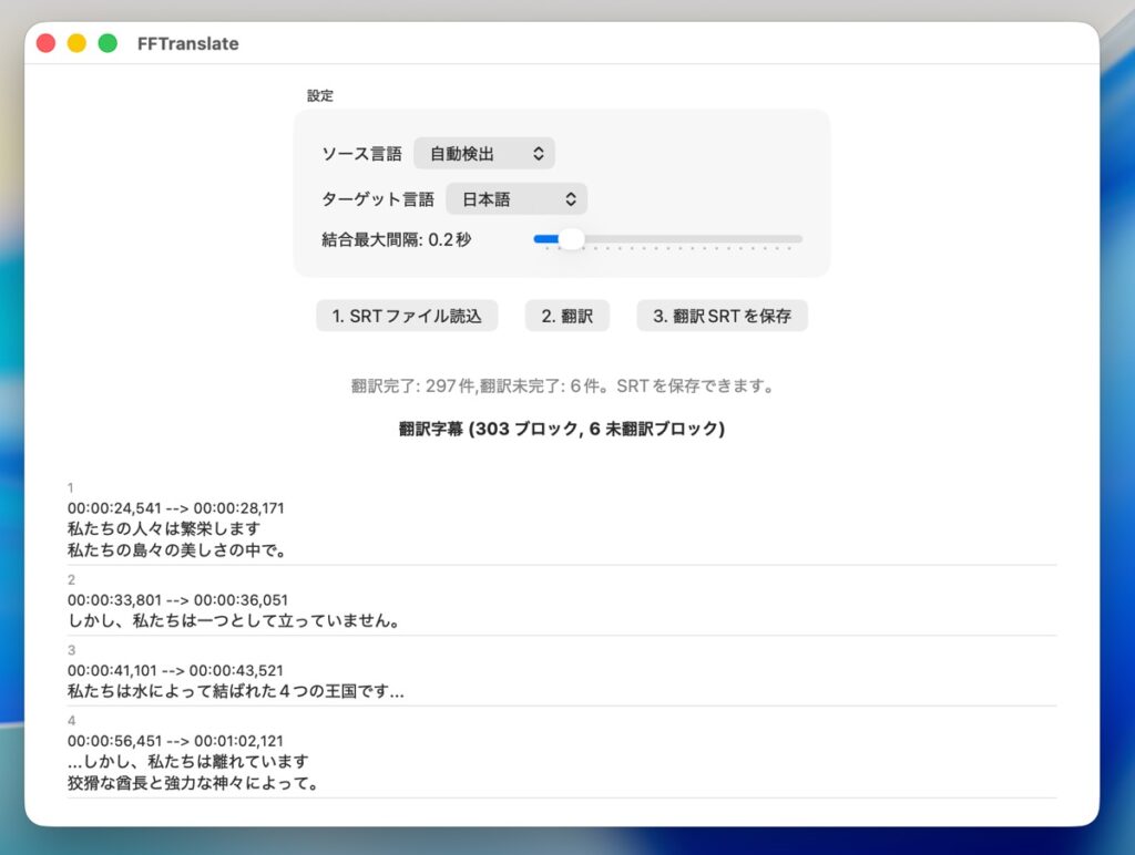 SRTファイル専用に設計され、より自然な翻訳を実現するためにブロック間の短い間隔を自動的に解析。複数の字幕ブロックを結合間隔や読点を基準に連結し、翻訳後は句読点単位で文とタイムラインを再構築することで、精度の高い翻訳と読みやすい字幕表示を両立しています。