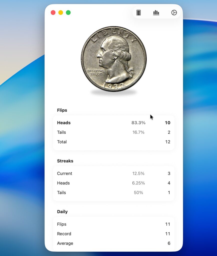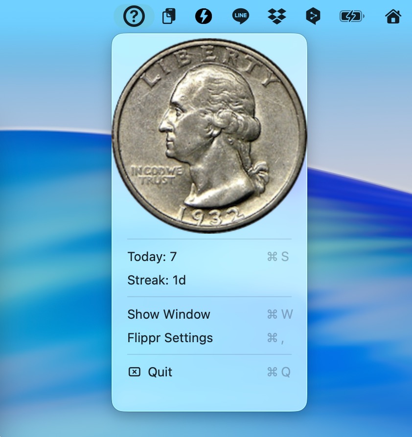 メニューバーにあるアイコンをクリックするだけで、コインの表または裏がランダムに表示されます。
