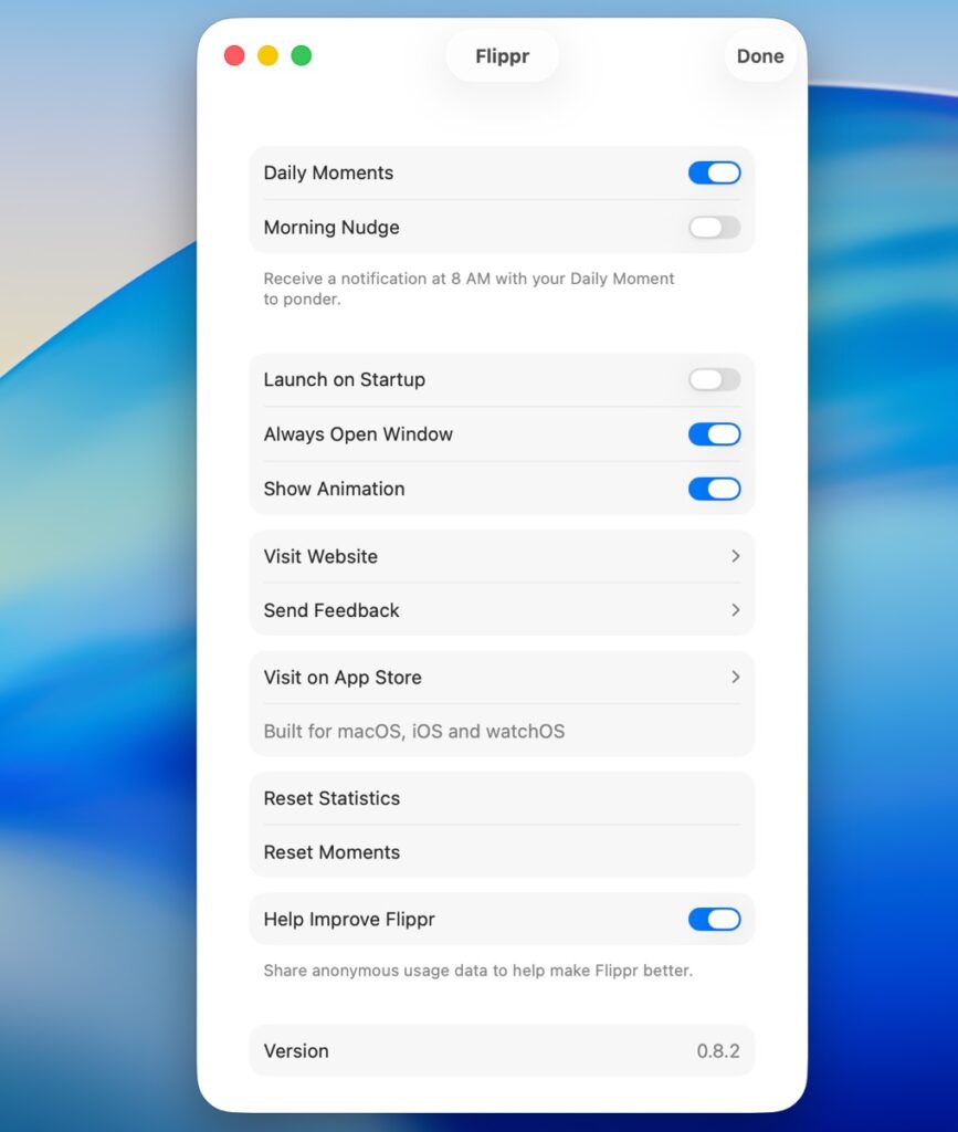 さらに、連続して同じ結果が出た回数(ストリーク)や、1日あたりのコイントス回数、過去の記録なども統計情報として可視化。設定画面では、アニメーションの表示切り替えや、ウインドウの常時表示、起動時の自動起動なども細かく調整できます。
