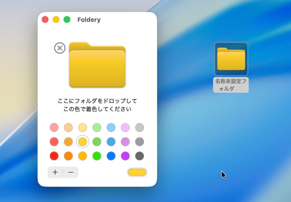 使い方はシンプルで、アプリ内で色を選択して対象のフォルダをドラッグ&ドロップするだけ。あらかじめ21色がプリセットされていて選ぶだけで利用できますが、自分でカスタムカラーを作成することも可能です。