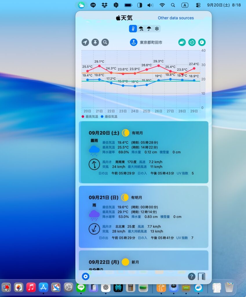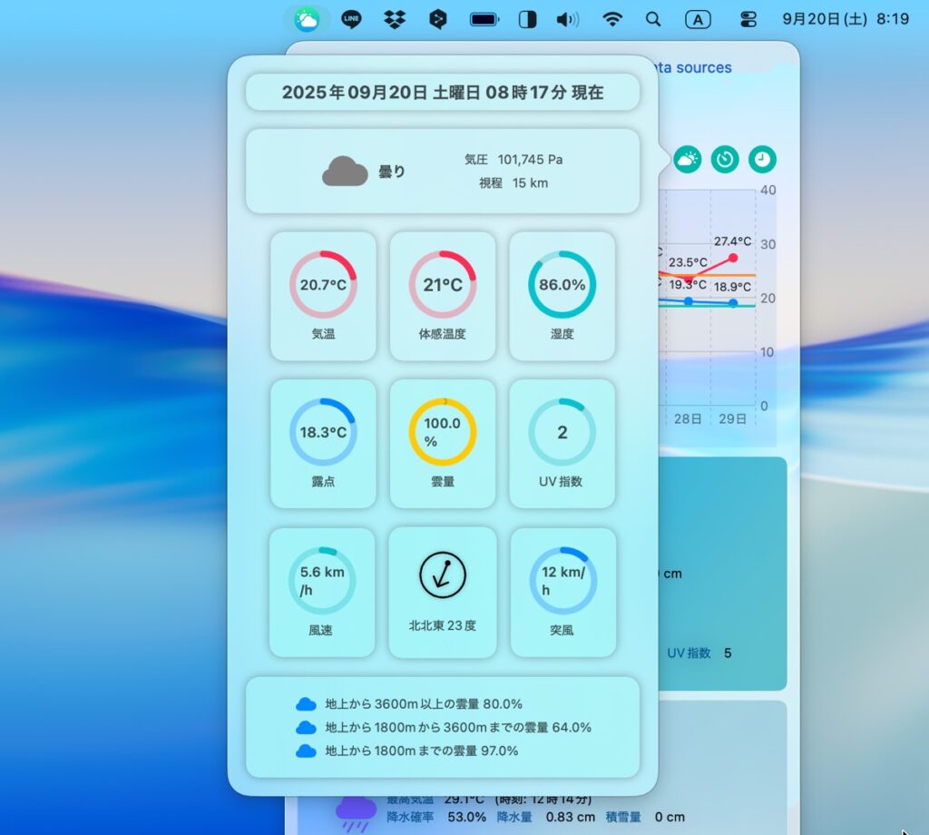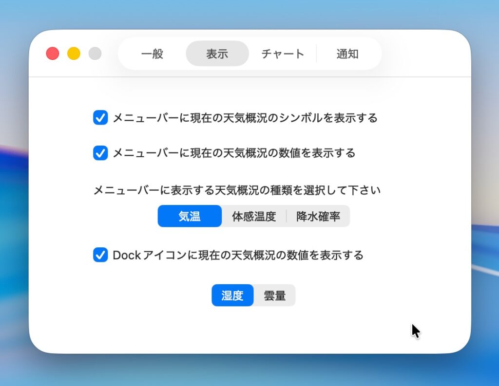 メニューバーには、天気アイコンと気温/体感温度/降水確率のいずれかを表示できるほか、Dockのアイコンに湿度または雲量を表示するオプションもあります。