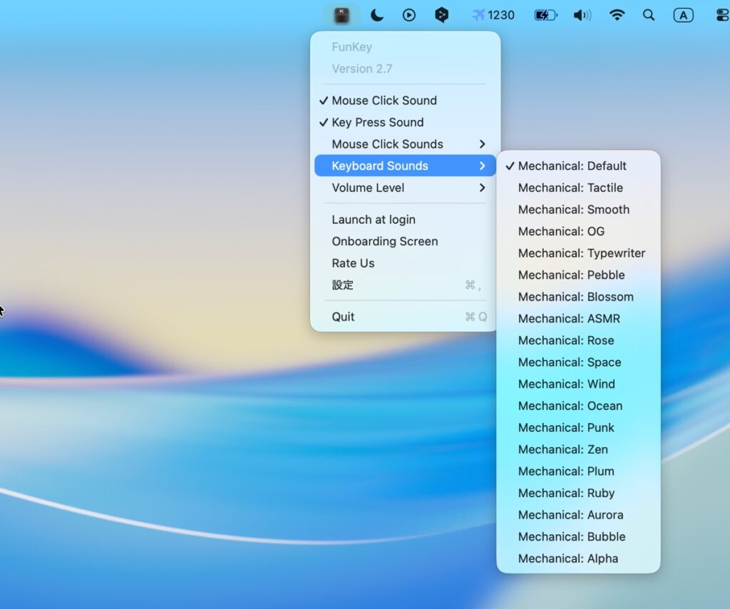 打鍵音は、タクタイル、タイプライター、Pebble、ASMR、Punk、Zen、Rubyなど16種類から選択でき、気分にあわせてメニューバーからワンタッチで切り替えられます。