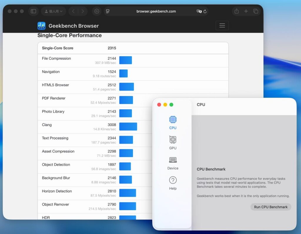「CPU」または「Compute」を選択して、「Run CPU Benchmark」ないし「Run Compute Benchmark」ボタンをクリックすると測定が開始し、完了するとWEBブラウザに詳しい結果が表示されます。