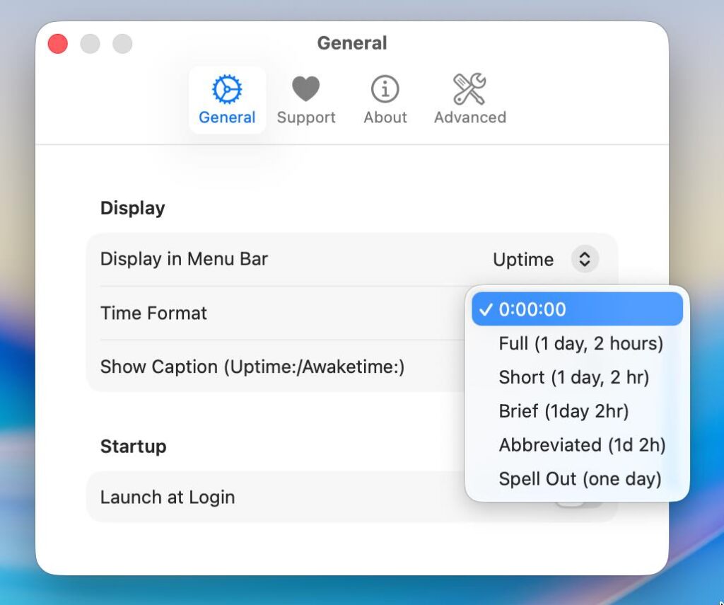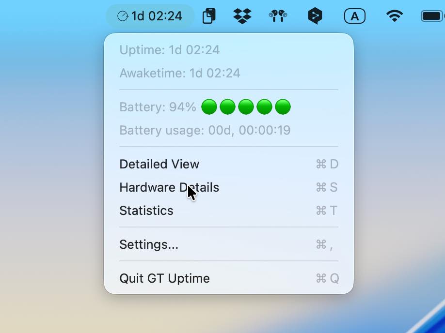 システムの起動から現在までの経過時間(Uptime)をメニューバーに表示します。