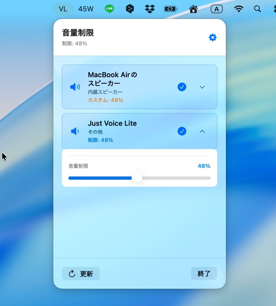 メニューバーの「VL」アイコンをクリックしてスライダーで最大音量を設定すると、システム音量をそれ以上のレベルに設定できなくなり、聴覚障害や近所迷惑を回避します。