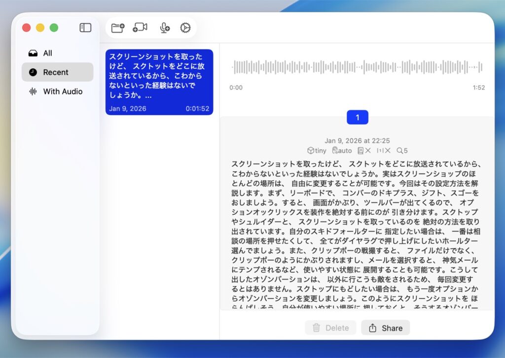OpenAIの音声認識モデル「OpenAI Whisper」と「Whisper.cpp」を用いた音声文字変換アプリ。